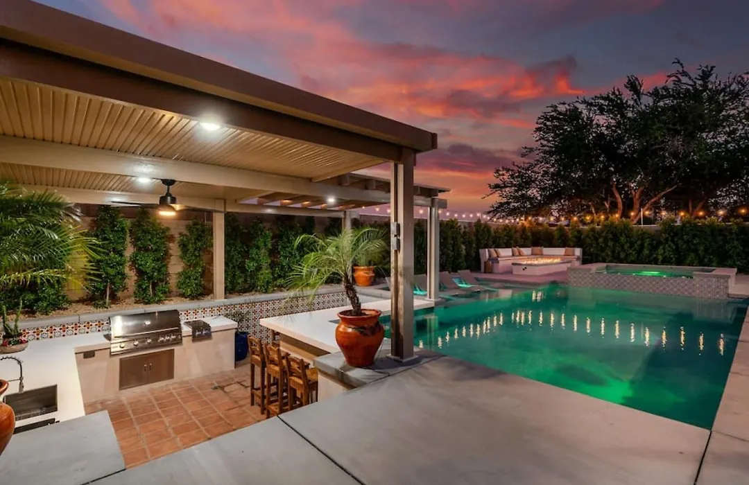 Willa Hacienda San Miguel Pool And Spa With Outdoor Kitchen oferuje czajnik elektryczny, lodówkę i szklane naczynia w wyposażonej kuchni. Goście mogą zjeść kolację restauracji Burger Box Incorporated, w odległości 17 min spacerem. Dojazd na Palm Springs International zajmuje 29 minut.